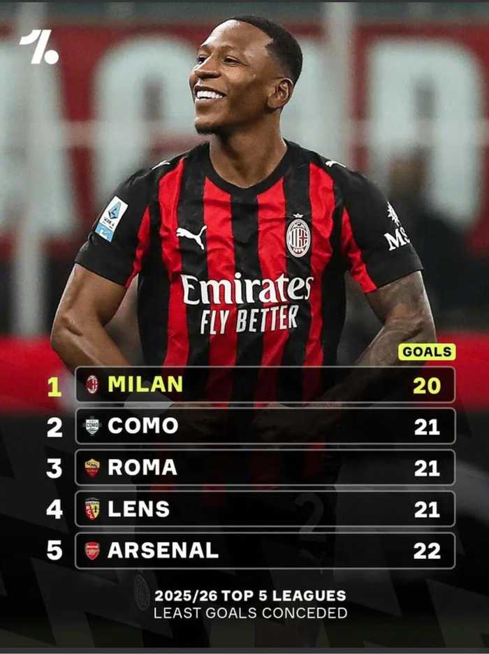 根据One Football的统计 ,AC米兰是本赛季欧洲五大联赛中失球最少的球队: